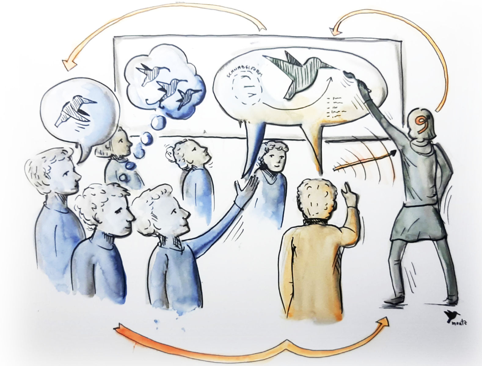 Beim Graphic Recording wird Diskutiertes in Echtzeit grafisch festgehalten. Die Methode ist besonders hilfreich für Coaches, Berater*innen und Trainer*innen, die Gruppen in Transformations- und Change-Prozessen begleiten. Zeichnerisch werden Inhalte und Stimmen der Teilnehmenden in Seminaren oder Workshops festgehalten. Die Visualisierungen verbessern die Verankerung der Inhalte, tragen zum besseren gemeinsamen Verständnis bei und es entsteht ein gemeinsam kreiertes Bild des Prozesses, des Ziels und der Veranstaltung. Prozessbegleitung entwickelt sich in Form von: