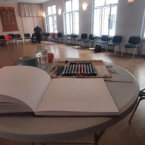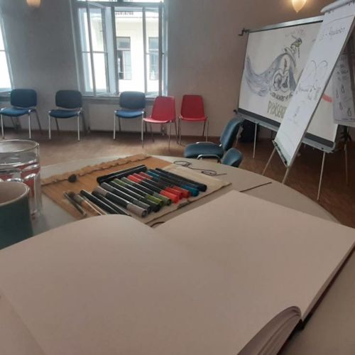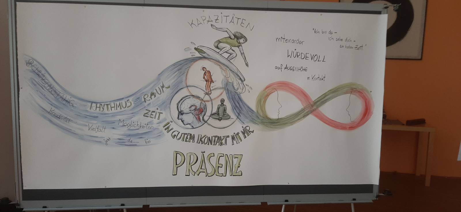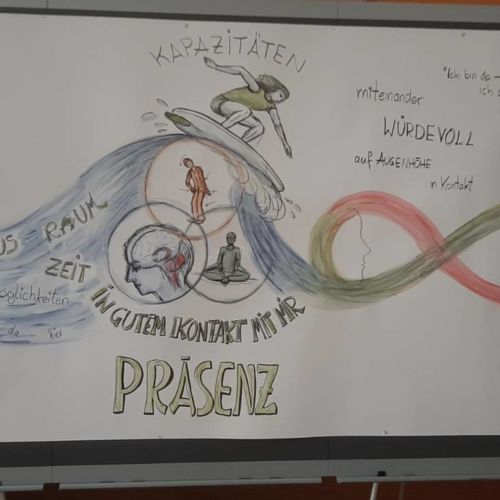 Die Teilnehmer:innen können in den Pausen im Buch blätter bzw. sehen sie wie sich das große Bild langsam weiterentwickelt und am Schluss ein repräsentatives Bild zu den 3 Tagen entsteht. Im Anschluss an das Seminar bekommen sie die Ergebnisse mit den Seminar-Unterlagen zu geschickt.